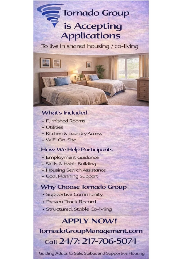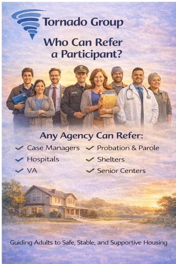 Tornado Group works with agencies and referral partners to provide structured shared independent living options for adults seeking housing stability. We offer a referral-friendly, non-clinical housing program designed to support individuals transitioning from unstable housing situations.